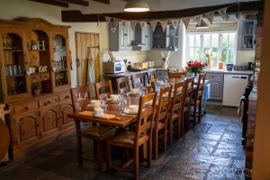 • Spacious kitchen with large farmhouse dining table seating 10-12. Rangemaster cooker, separate electric cooker, dishwasher, fridge, microwave, coffee machine, slow cooker, food processor, sandwich toaster and food warmer. Plenty of cutlery, crockery, glassware and cookware.