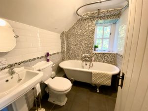 • Family bathroom with roll top bath and shower attachment.
